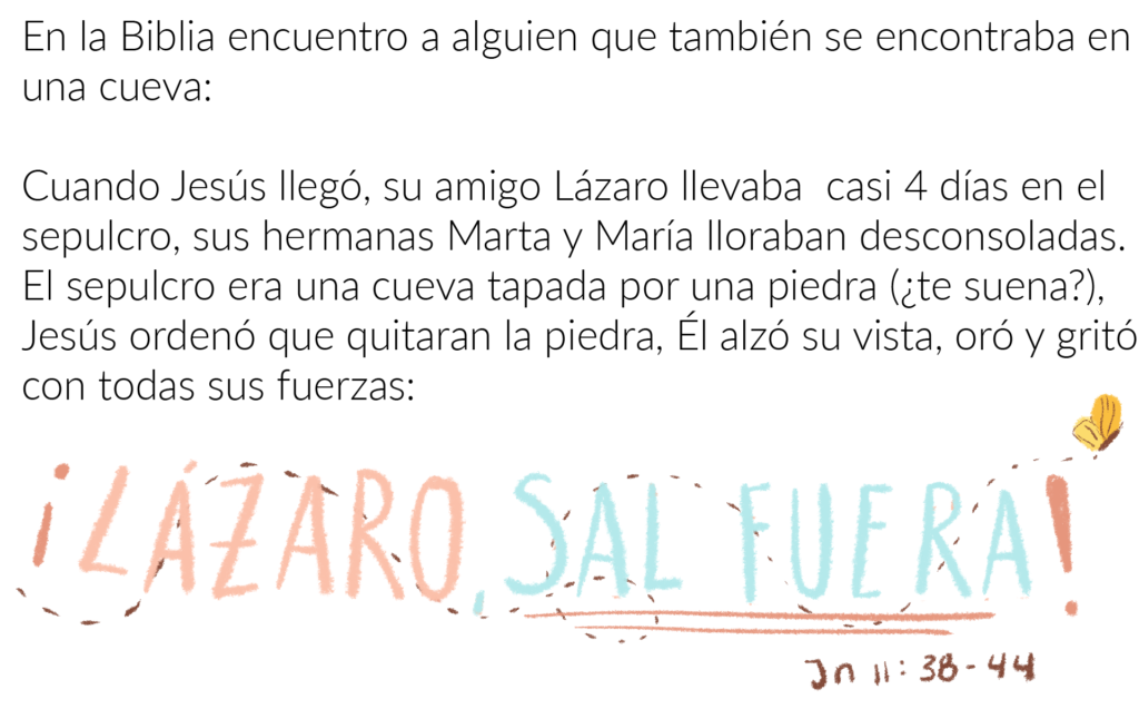 Gracias Gabi!!!! Me encantó la reflexión con las ilustraciones… es muy cierto.. muchas veces me he sentido en la cueva, me cuesta salir, me cuesta soñar…. pero tengo del otro lado de la cueva a Dios, que siempre me anima a dar un paso más de fe.. 🙂